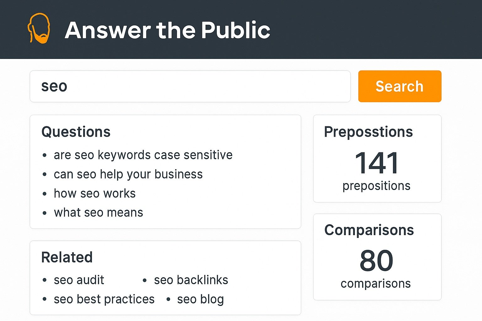 - Analyseschwerpunkt: Es werden zum eingegebenen Keyword jegliche Fragen und Longtail Keyword Kombinationen geprüft.